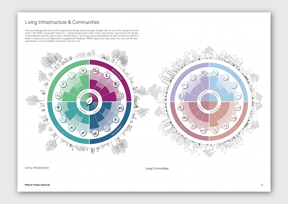 The Code follows the government’s National Model Design Code, which identifies 10 Characteristics of Place. We wanted to ensure that these different characteristics weren’t tackled in isolation, but instead as interconnected components of a good place, and to do this we grouped these 10 characteristics into two structured groups: Living Infrastructure brings together Public Space, Movement, Nature and use of resources. Living Communities combines themes of building design and use.