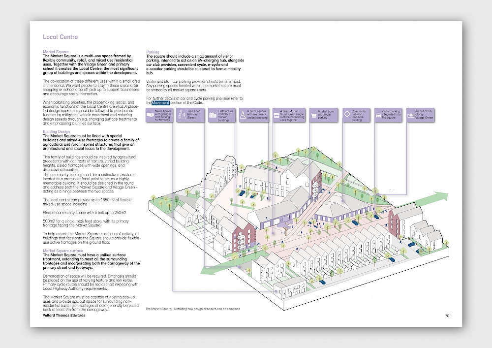 The Code was written over a period of eight months, using frequent structured workshops that tracked the development of the document. PTE and McGregor Coxall, the landscape architects for the code, worked together to ensure an integrated coding approach. A multidisciplinary consulting group was established, with representatives from both the local authority, county, and client, and maintaining that group throughout helped deliver consistency and consensus. A key move was to start with an away-day for all the consulting group to visit recently completed local projects that had used design codes. This built relationships and a shared appreciation of what a good result looks like, and the challenges we might meet delivering it.