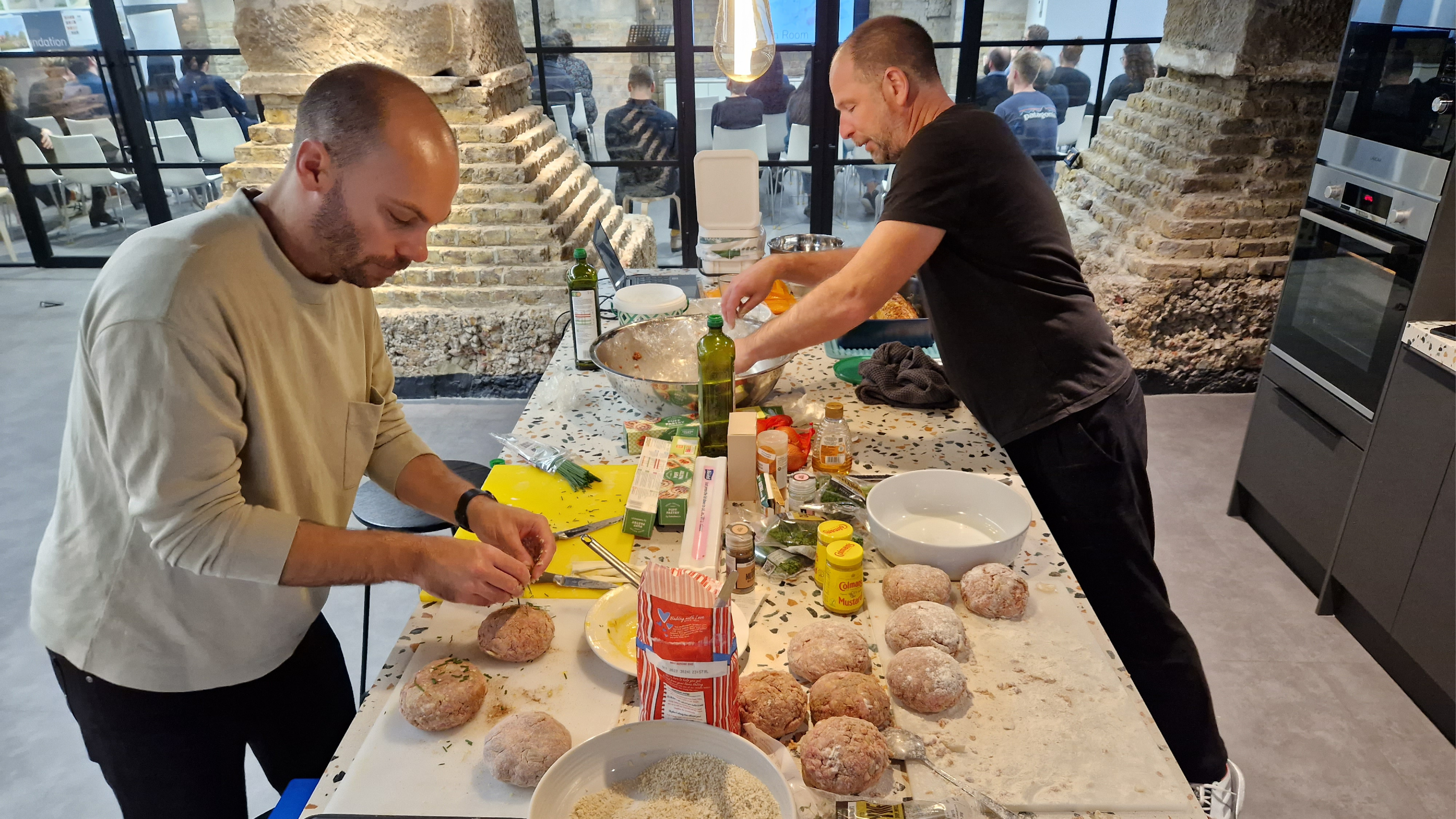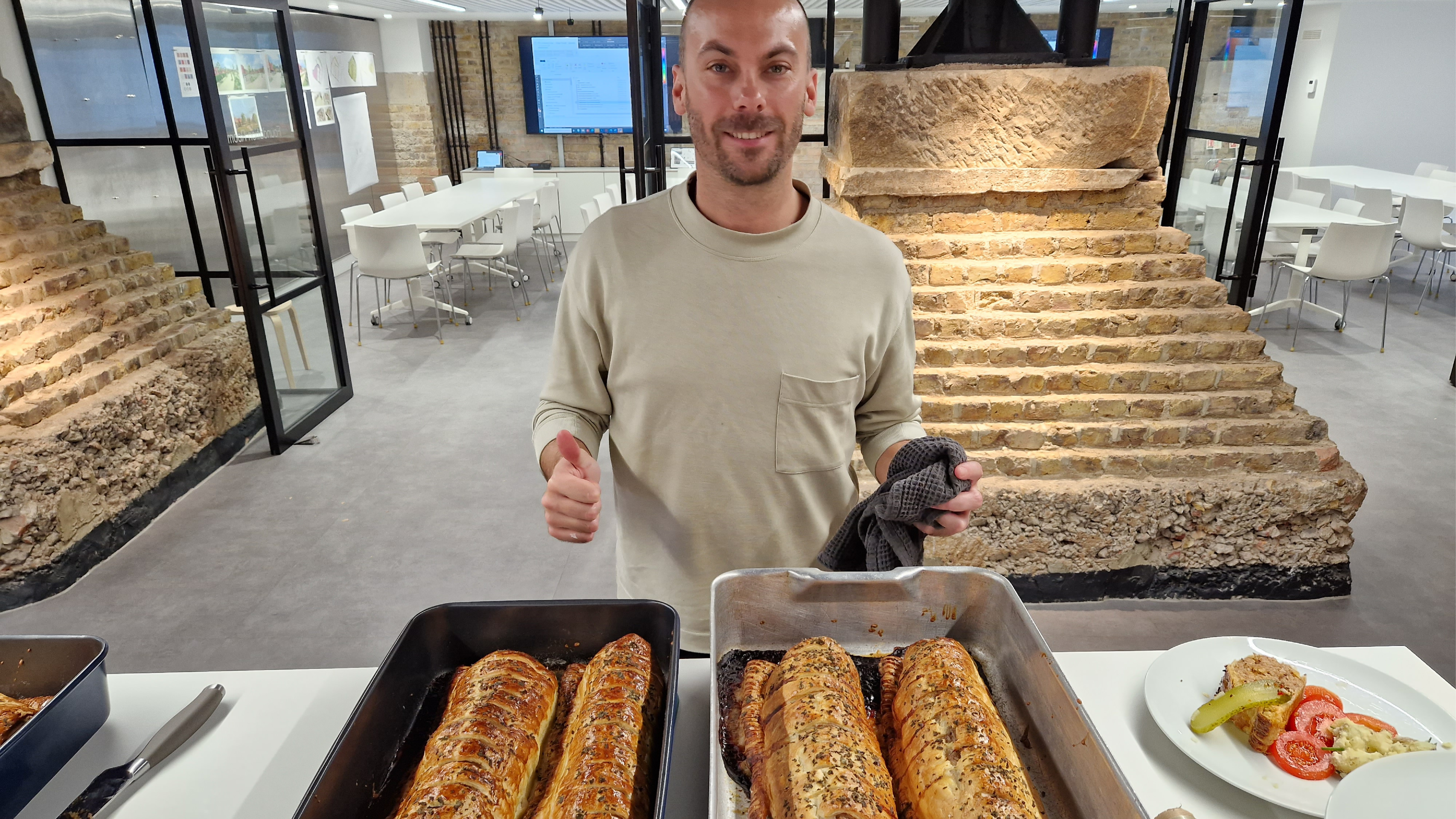 Lunch, prepared by partner Simon Whitley, had a village fete theme – vegan and sausage rolls (with brown sauce).