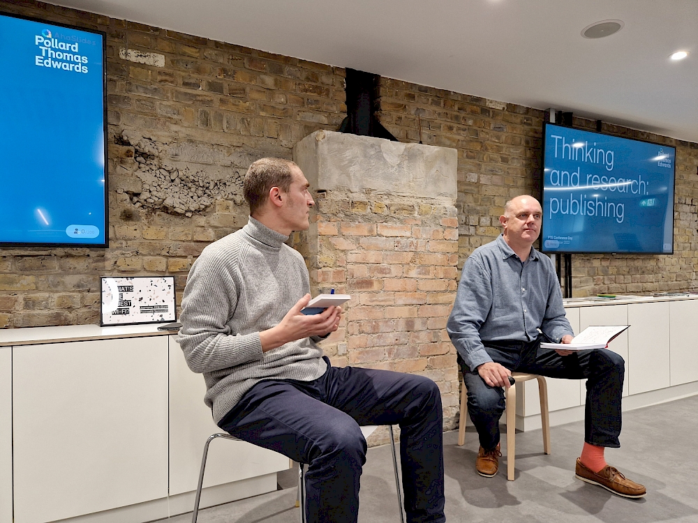 The Research and Thinking session, with partner Patrick Devlin and writer and critic Rory Olcayto, centred on ‘publishing’ – online, in mags, books and events. Patrick gave an overview of PTE’s own publications, from our government-backed HAPPI report (2009) and At Home with PTE (published by The AJ) to our estate regen books – Altered Estates I and II – co-produced with other architects and The Deck Access Housing User’s Guide for Routledge (January 2023).The interactive session also produced word clouds from audience responses to which books, magazines, online publications and events had helped shape their design outlook.