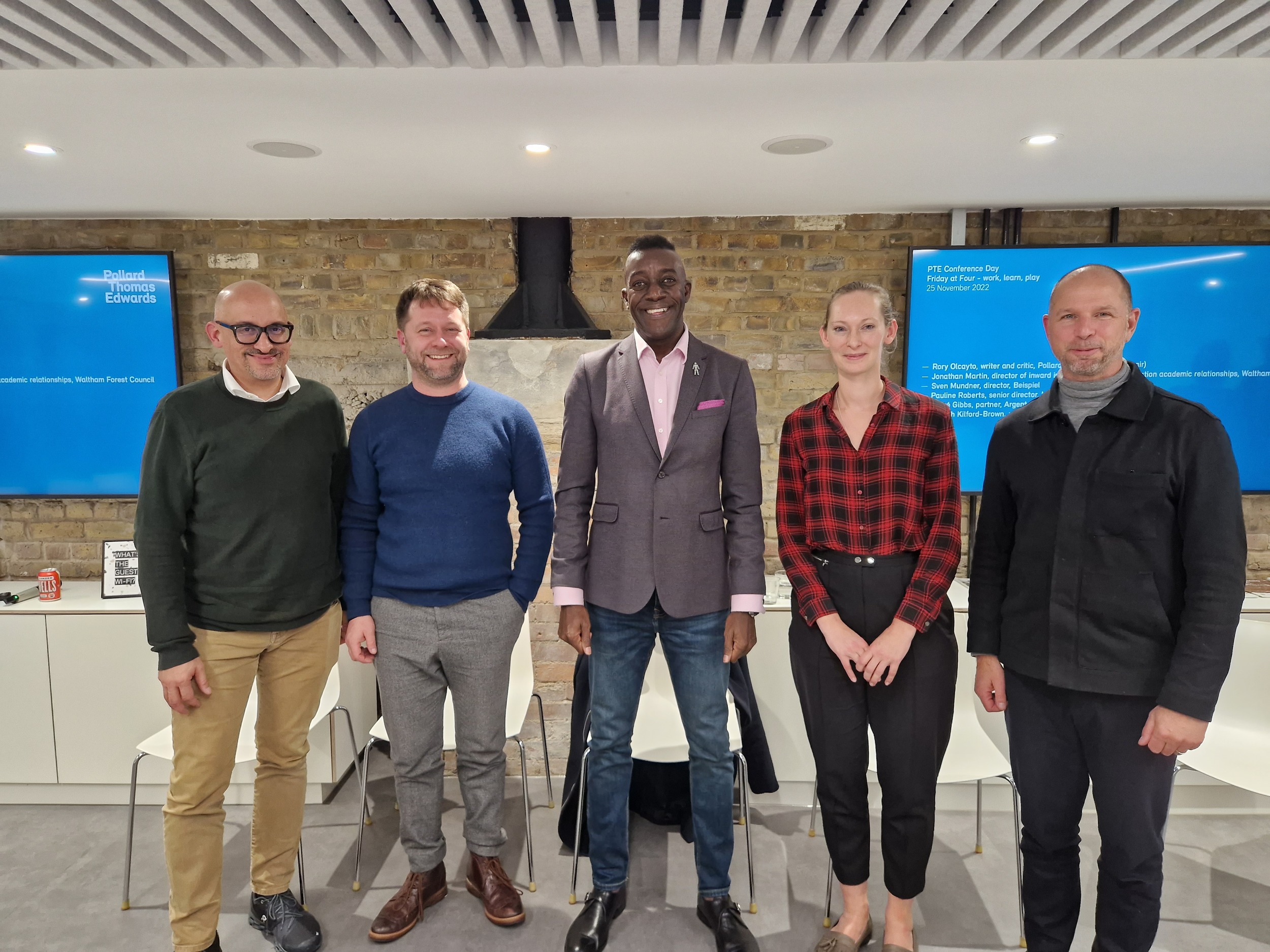 This Friday at Four saw four guest panellists join Hamish Kilford-Brown on stage, with Rory Olcayto chairing a wide-ranging debate inspired by the ‘work, learn and play’ theme. Jonathan Martin, Waltham Forest’s director of inward investment & higher education academic relationships, spoke about his borough’s culture industries profile and how it is creating meaningful place-specific jobs in this sector. He cited Walthamstow’s Blackhorse Workshops which has been combined with the borough’s creative academy. Beispiel’s Sven Mündner made the case for social value (pointing to John Soane’s altruistic and ‘make-do’ forging of the Dulwich Picture Gallery) to show that it has always been fundamental to the architect’s societal offer while Pauline Roberts of Lichfields, explored post-covid engagement strategy. Argent’s André Gibbs finished the presentations, musing on low carbon lifestyles and building communities in Brent Cross Town, before the audience joined the discussion – which continued over drinks and snacks in the Foundation Bar@Five (it’s become a thing!)