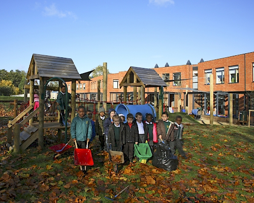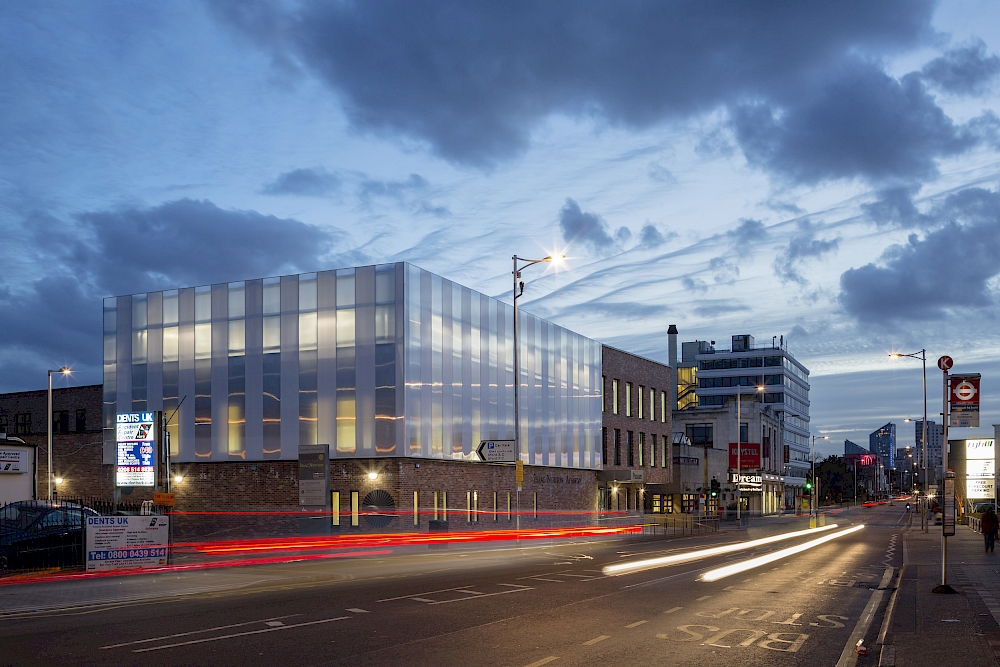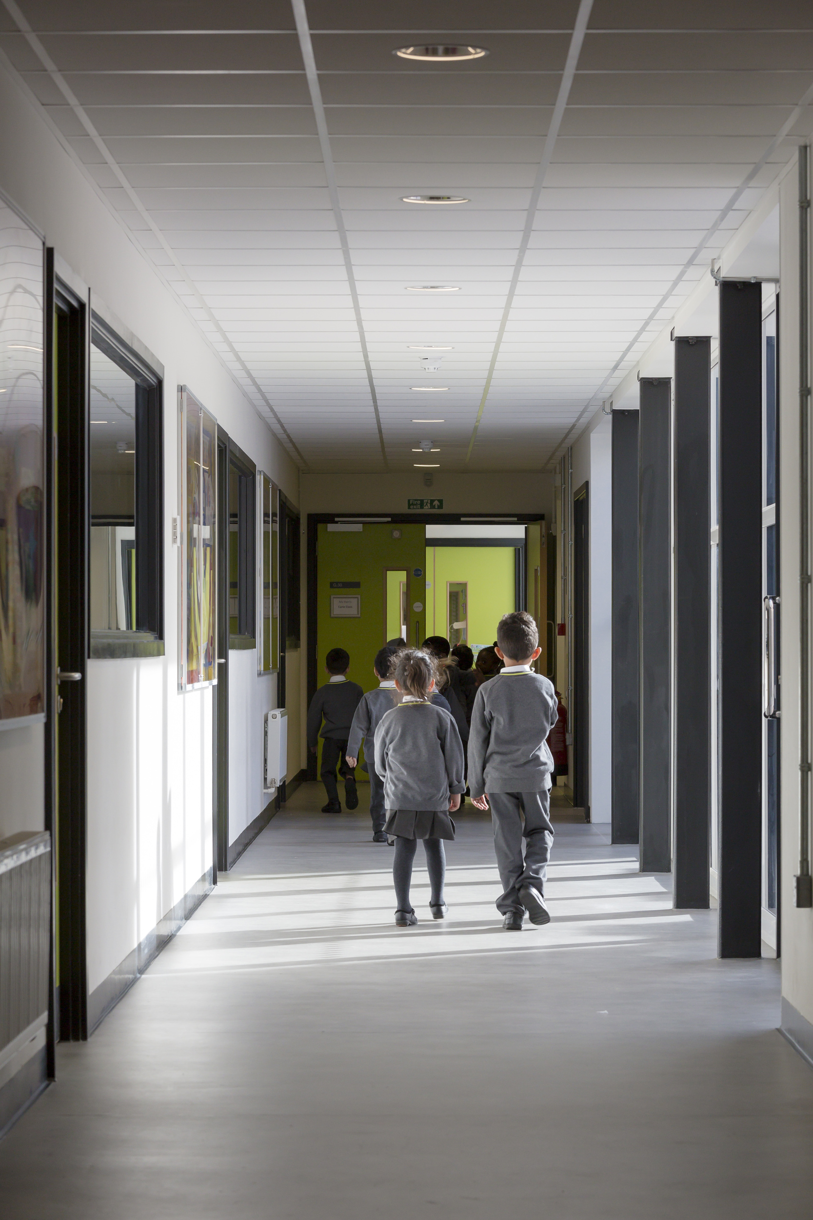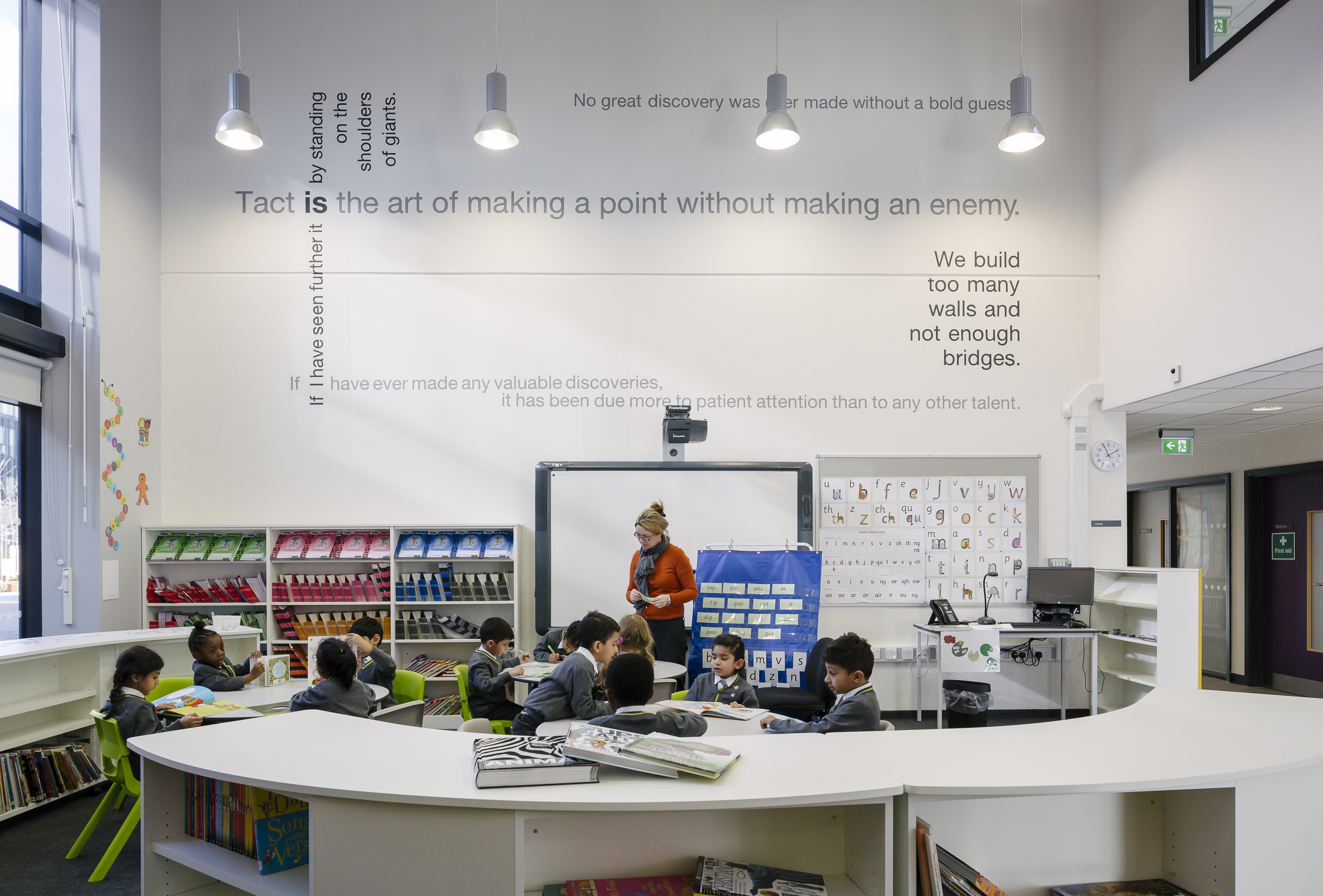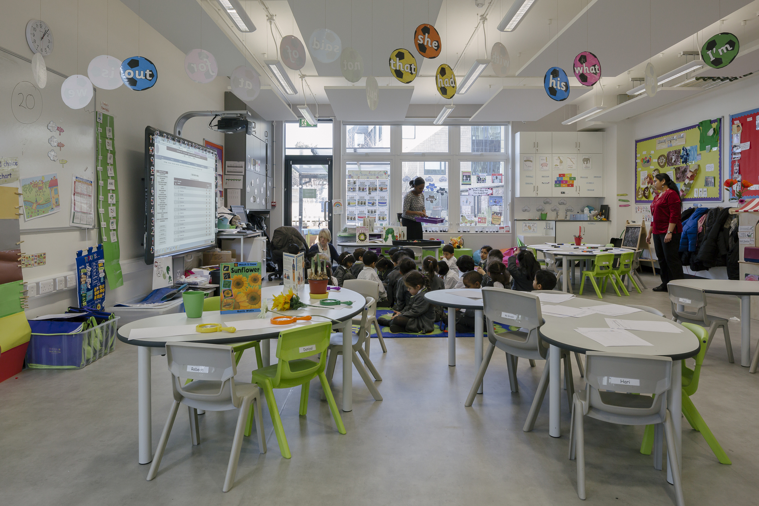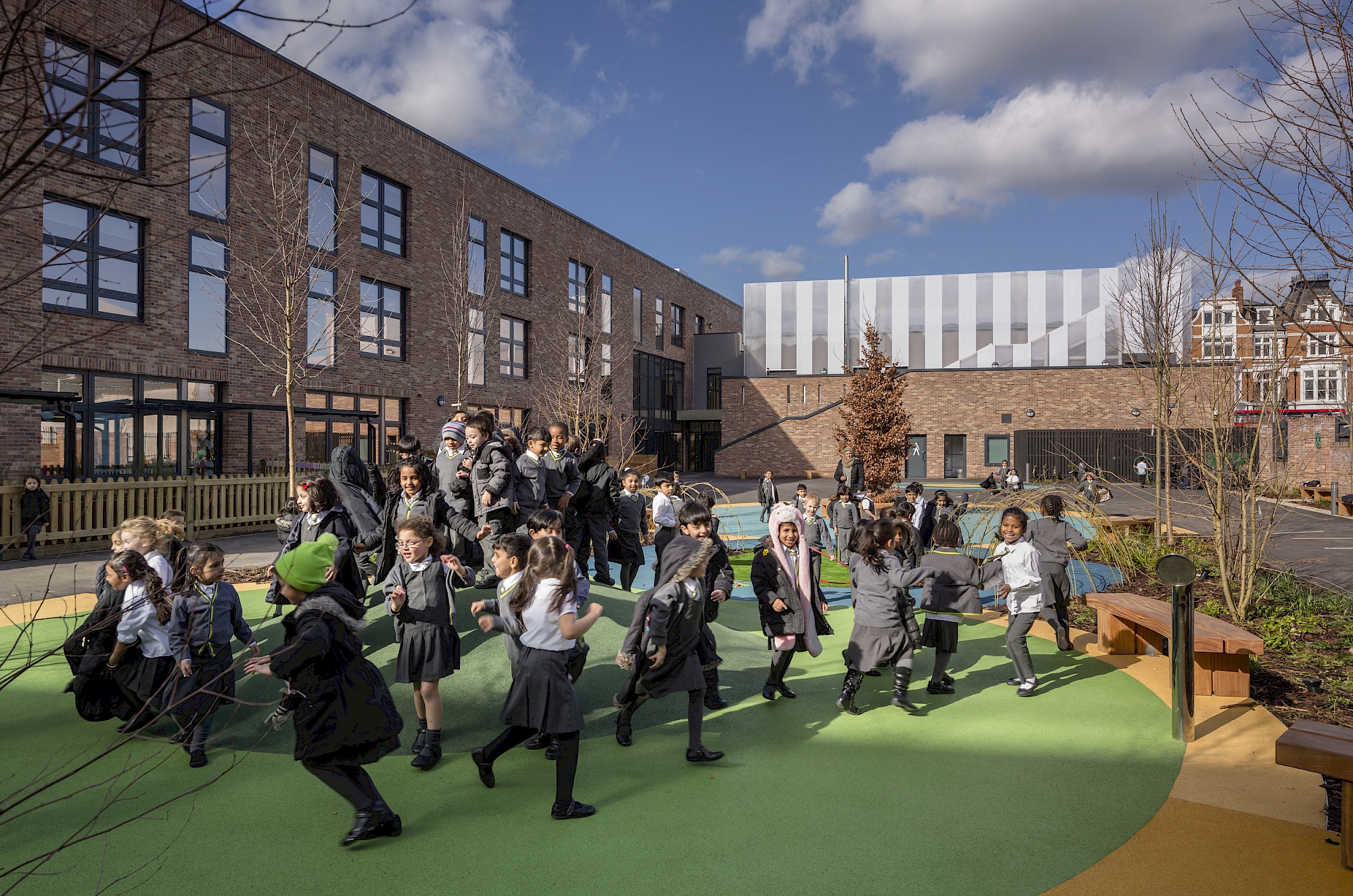 This new three-form-entry primary school on Ilford High Road features a glowing translucent hall topped by a ball court. It creates a physical and visual link with the adjacent secondary school to become an all-through academy.