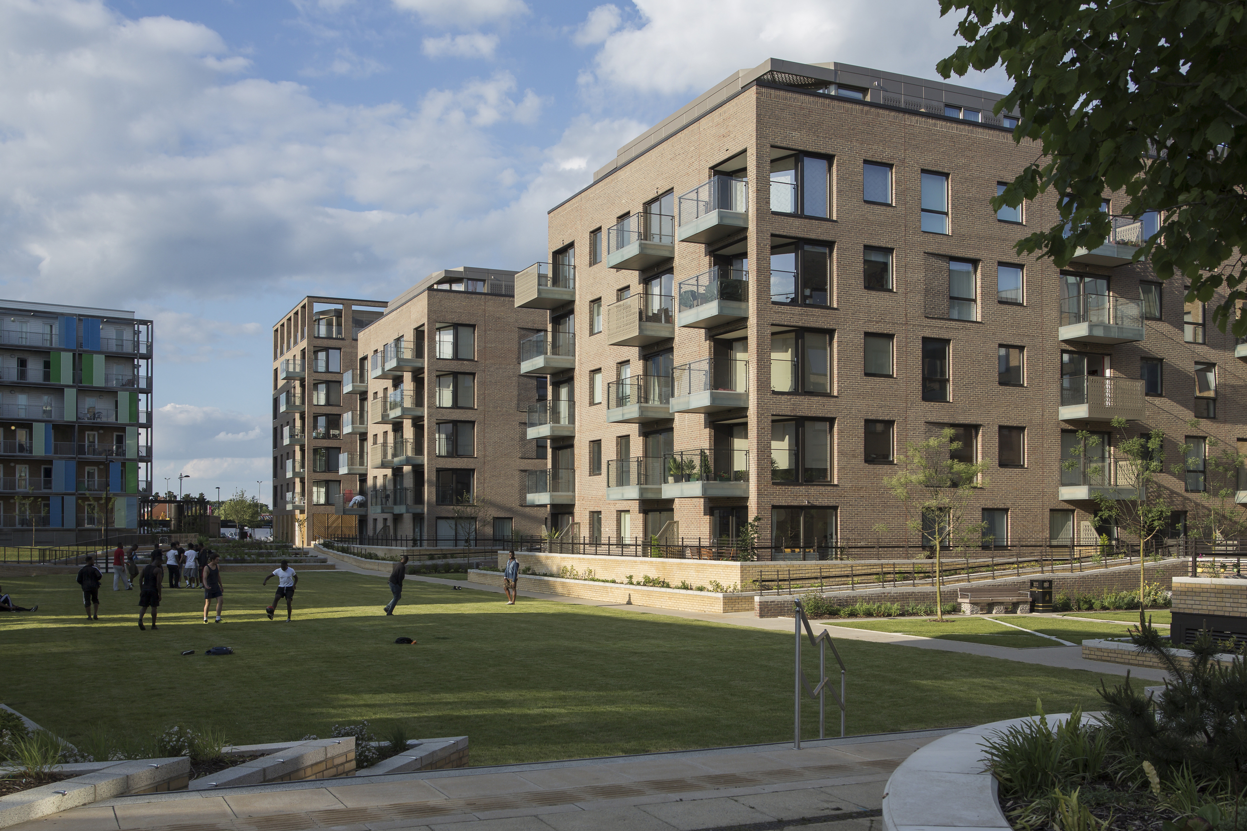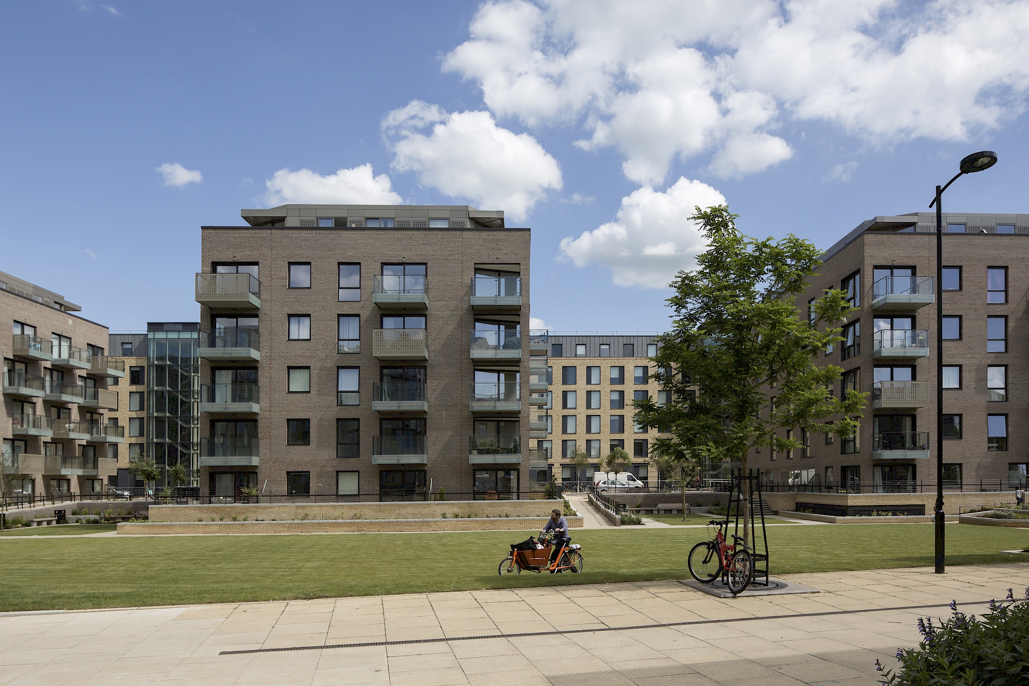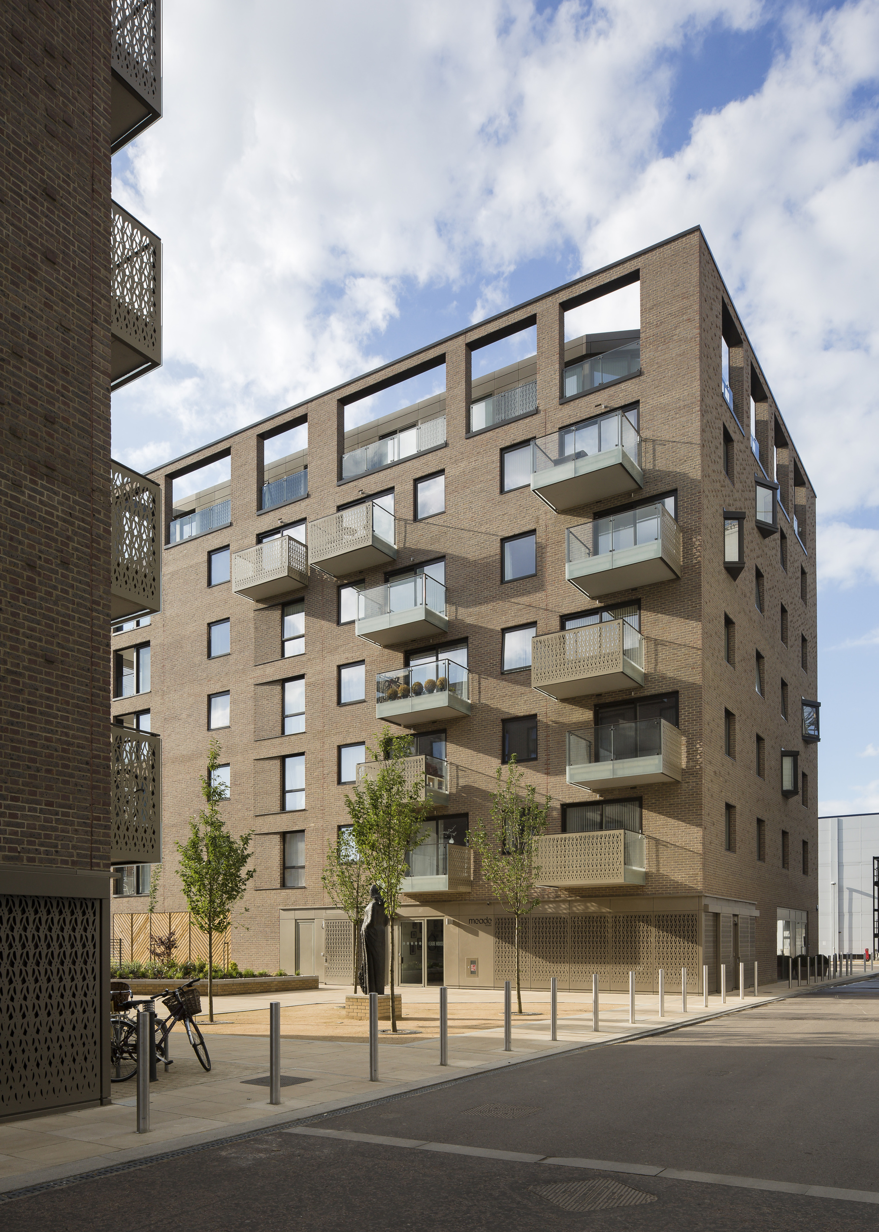 Within the new urban quarter emerging around Cambridge railway station, PTE has delivered a group of four ‘pavilions in the park’ containing 150 apartments, and has restored the historic Foster’s Mill. The detailing is exemplary and features robust patterned brickwork and decorative metal screens to balconies and stores.