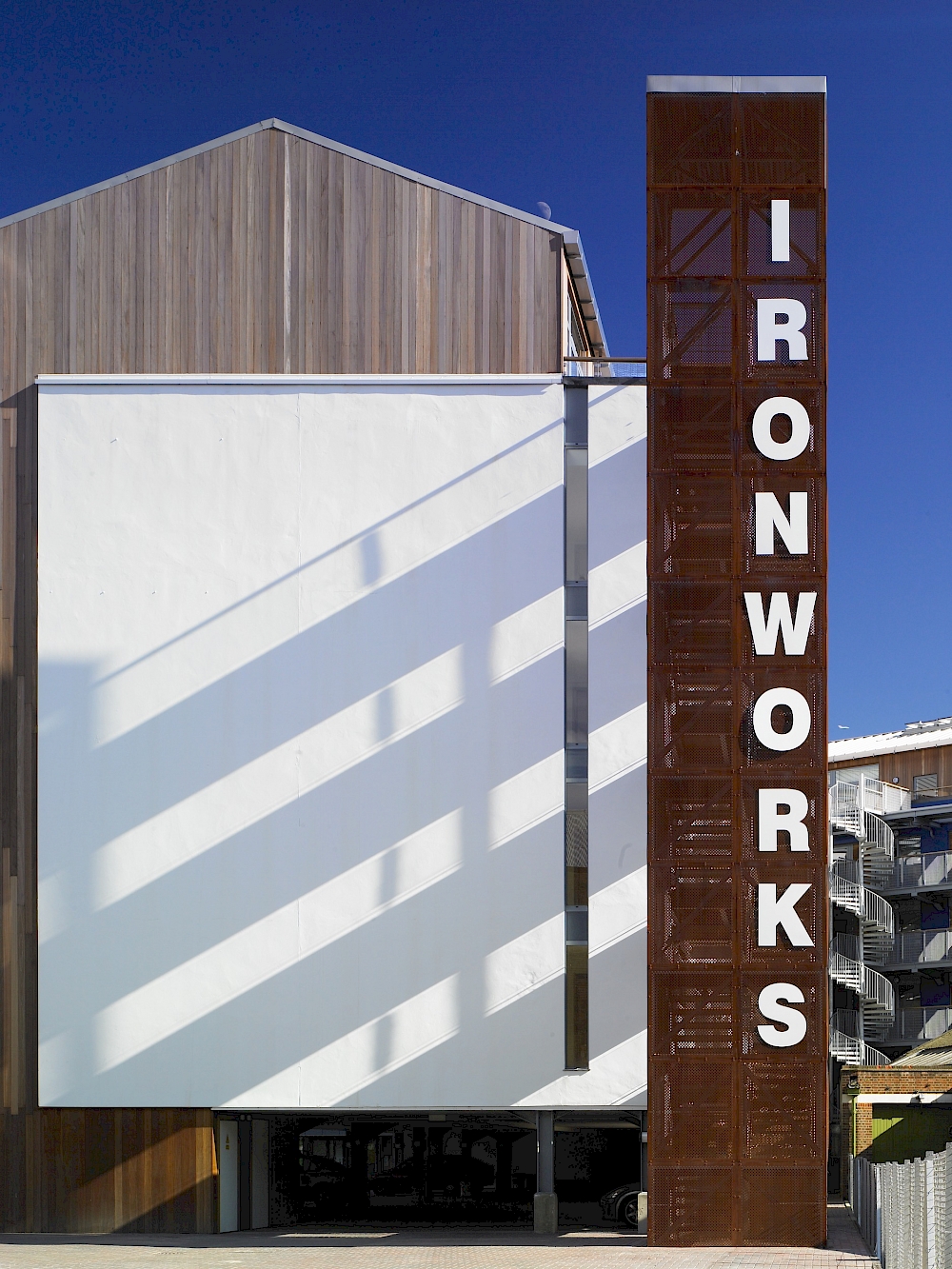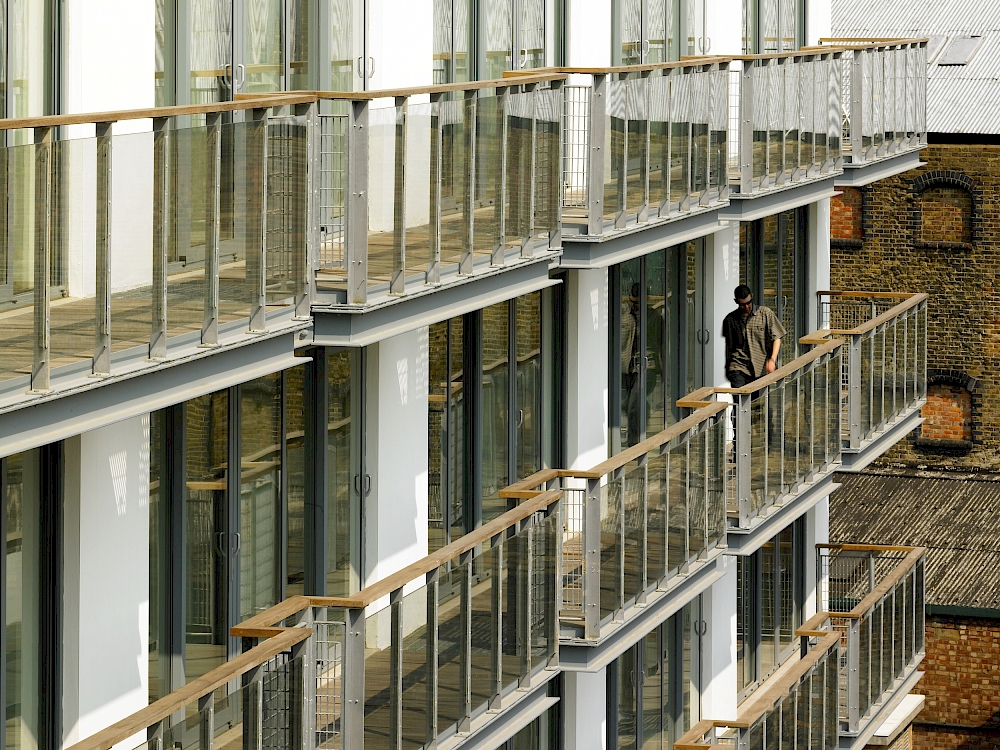 Our scheme has transformed this site into a development of 77 live/work units and commercial space set around a tranquil courtyard open to the Lea River basin with spectacular views over the water towards the Olympic site. The southern wing terminates in a nine-storey ‘full stop’ which overlooks the basin, with projecting glass bays taking advantage of views both up- and down-stream. The scheme also retains the old industrial forge building.