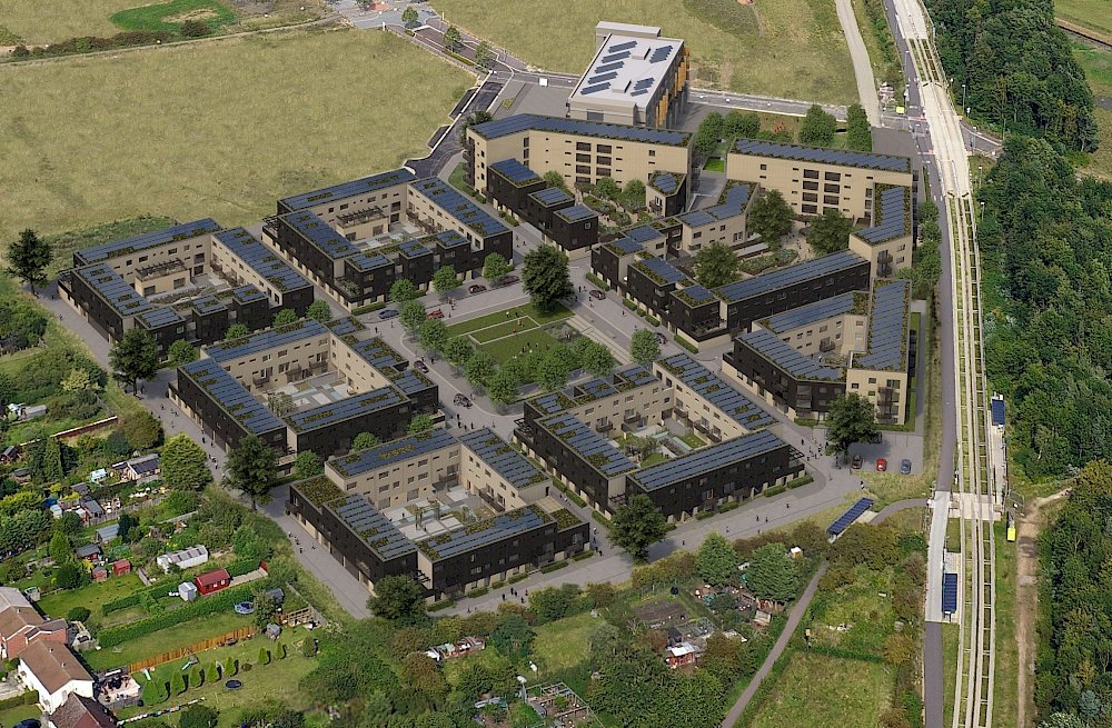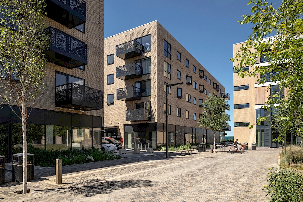 This exemplar development combines the very best in design and environmental sustainability, achieving Code for Sustainable Homes Level 5. Within the broader masterplan for Clay Farm, the scheme created 208 new homes arranged in a grid of quads surrounding a new park at the heart of the site.